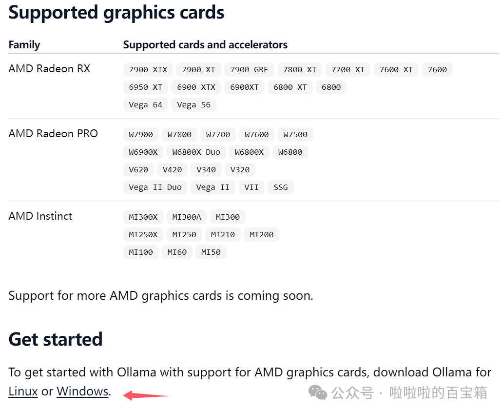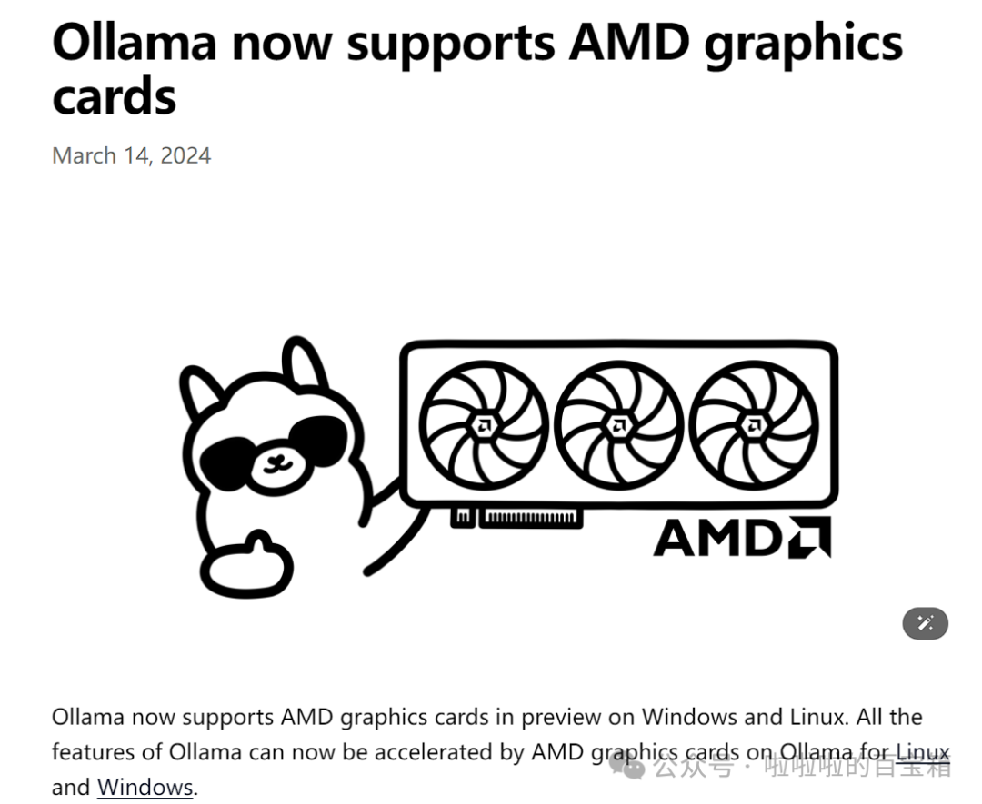 因为穷(bushi✘),广大的DIY玩家因为各种各样的原因选择了AMD显卡,让我们相聚于此。AMD显卡相较于NVDIA以其高性价比著称,奈何NVDIA早已建立起CUDA的壁垒,AMD显卡在人工智能领域“有劲使不出”或者算力较NV差。几个月前,Ollama支持了部分AMD Radeon显卡以及AMD Radeon Pro显卡,让广大玩家有了尝鲜的机会,接下来咱们展开说说