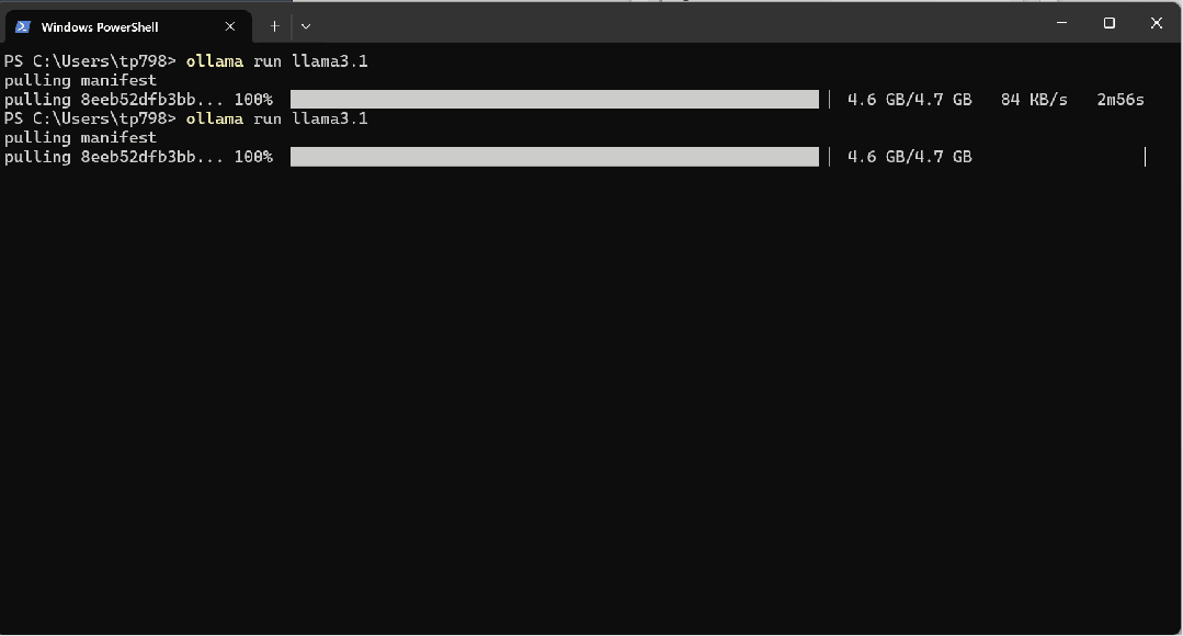 在终端中输入ollama run llama3.1,相应的8b模型会被下载下来(可正常拉取),速度取决于网速,一段时间下载完成后将自动调用模型,即可与大模型对话。