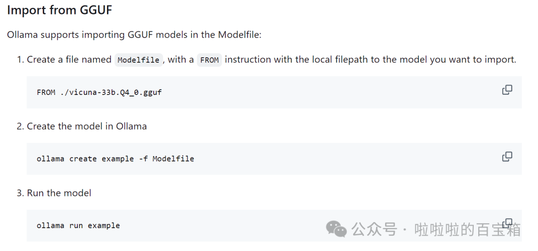 除了Ollama官方提供的模型外,Ollama也可以使用从Huggingface或者魔搭社区(可正常访问)下载模型,分为GGUF和PyTorch or Safetensors两种。