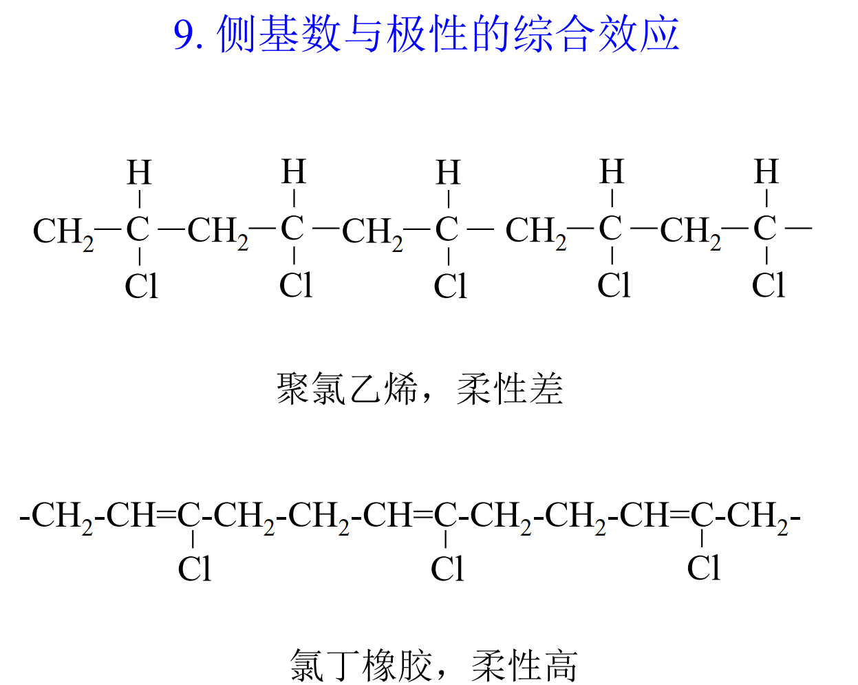 - 柔性:聚氯丁二烯>聚偏二氯乙烯>聚氯乙烯>聚1,2-二氯乙烯