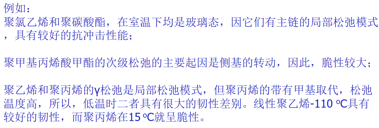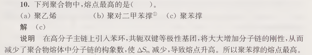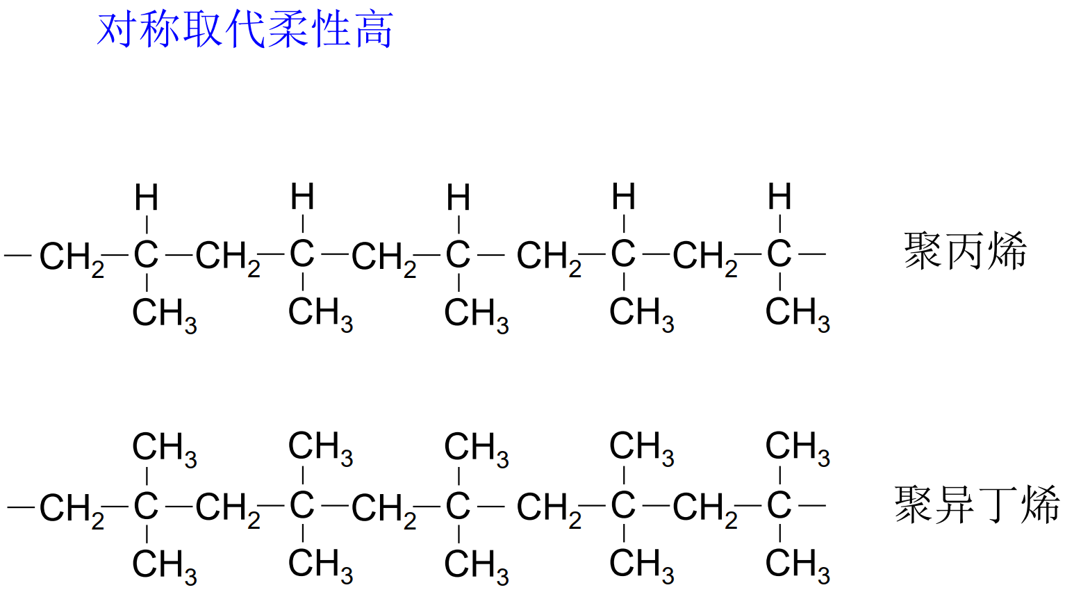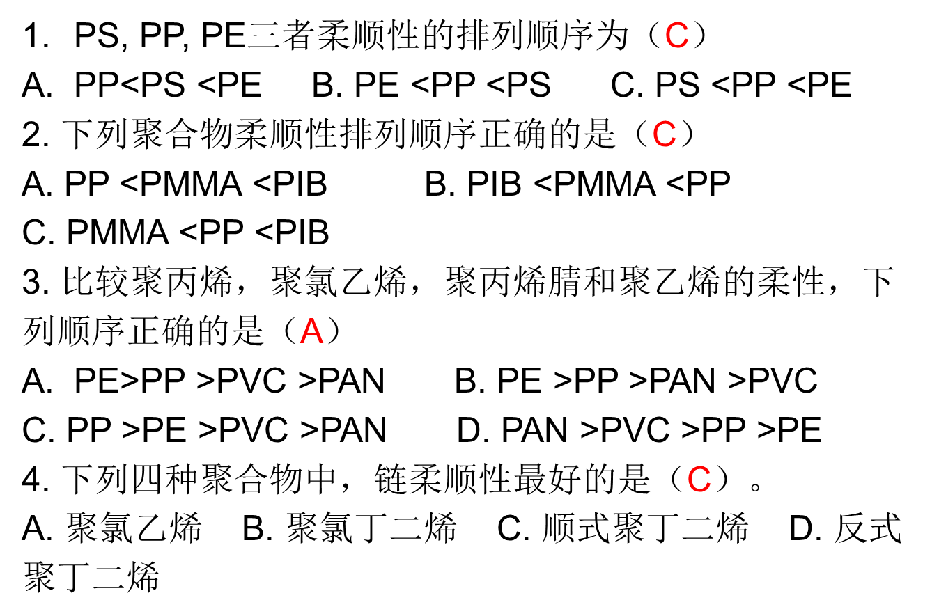 - 柔性:聚丙烯>聚甲基丙烯酸丁酯>聚甲基丙烯酸甲酯>聚3,4-二氯苯乙烯