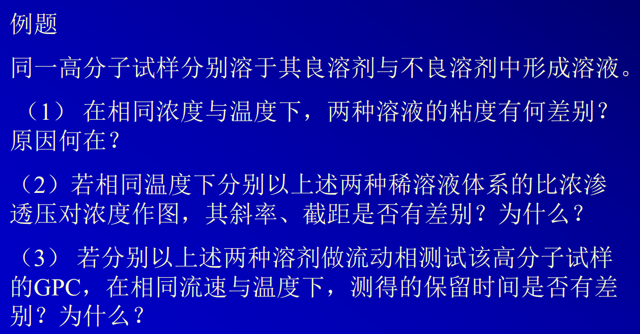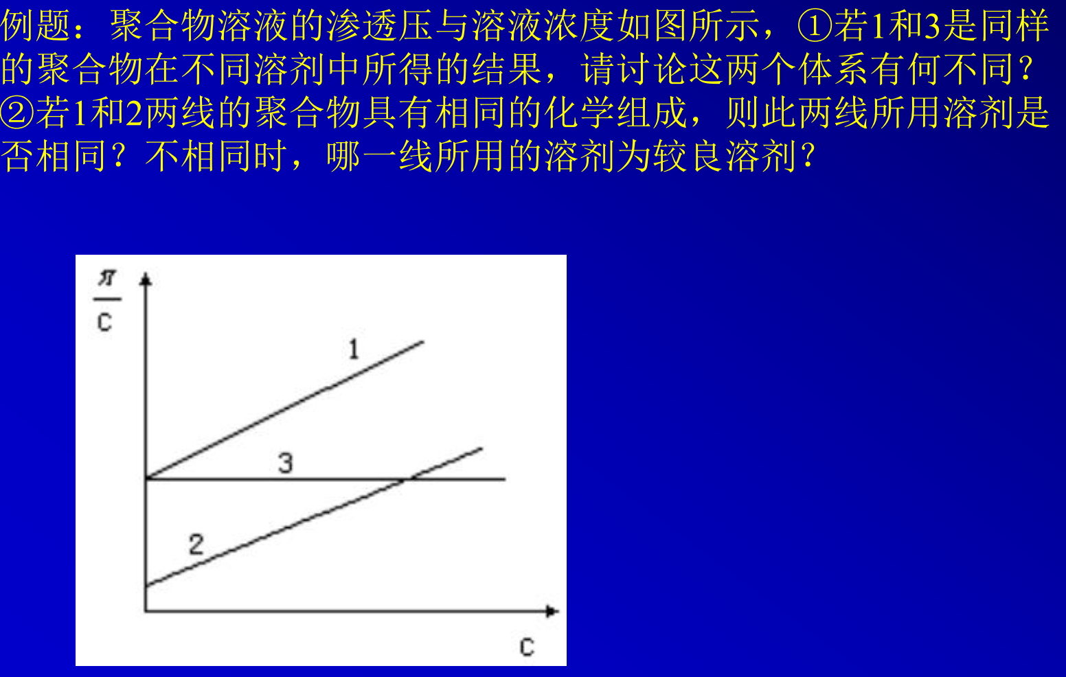 - 比浓渗透压(π/c)对浓度作图的截距(RT/M)相同,因为分子量M一致;但斜率(RT·A₂)不同。良溶剂的第二维里系数A₂为正且较大,斜率更大;不良溶剂中A₂较小甚至为负,导致斜率更小或为负。差异源于溶剂对高分子链段排除体积效应的影响