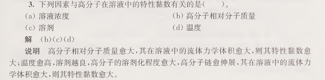 - 高分子的特性粘度随溶剂化作用增大而增大(溶剂化作用强时,链展开,均方末端距大,流体力学体积大,特性粘度大)