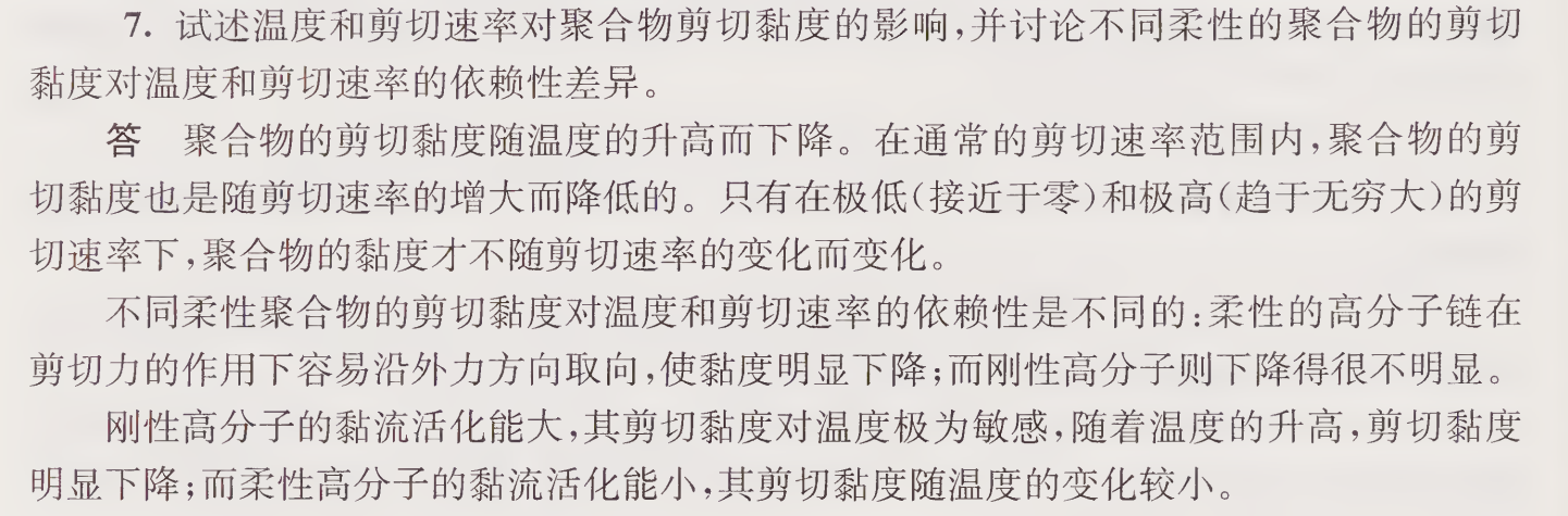 在聚合物的相对分子质量范围内,高聚物的粘流活化能不随相对分子质量而变化。聚合物熔体属于假塑性非牛顿流体,其粘度随着剪切速率的增大而下降,随温度的升高而降低