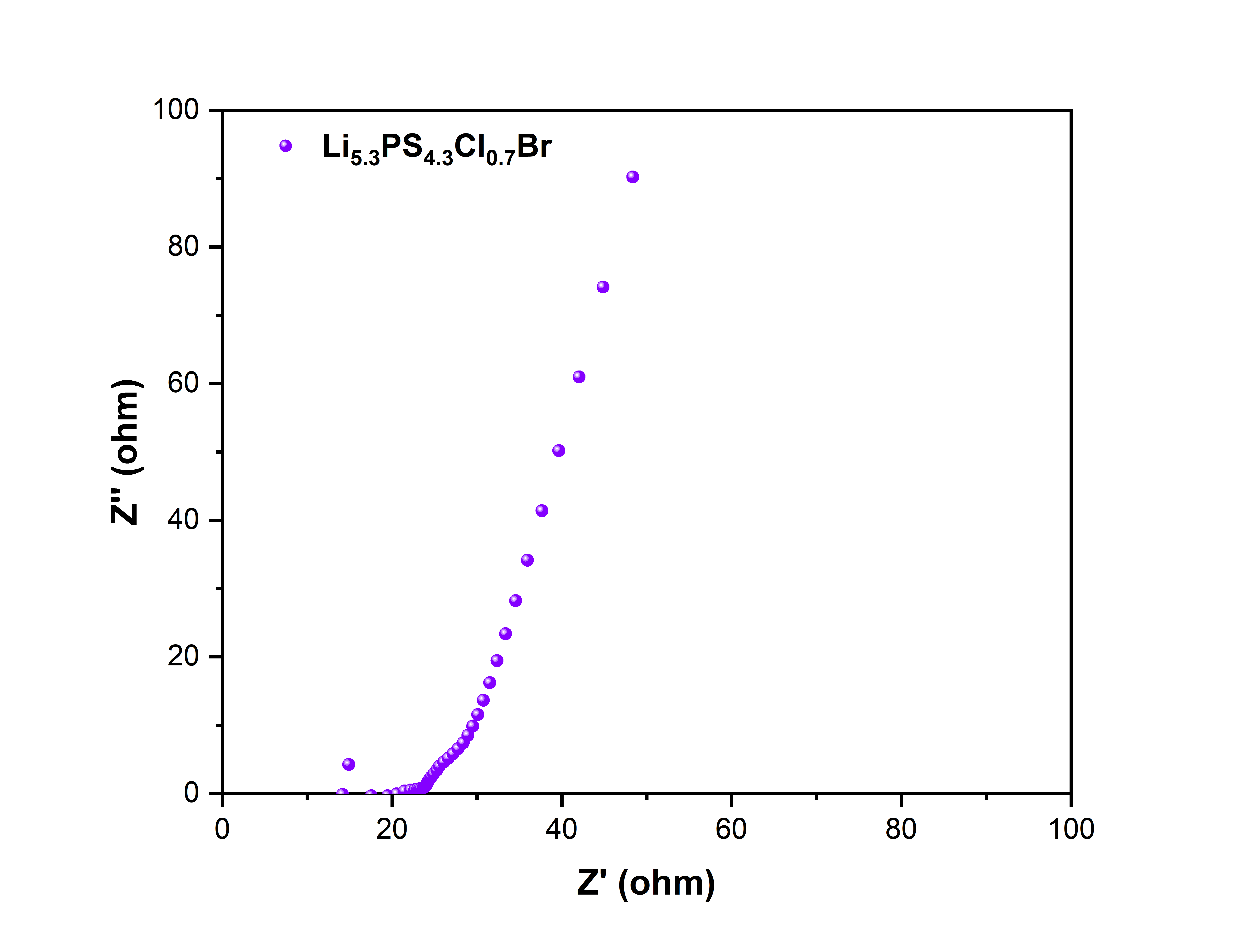 首先在手套箱中称量药品并转移至球磨罐中,两罐为不同样品,原料总重均为1.000g,球磨参数为300rpm/min,磨10min休息3min,60cycles,将球磨完的样品转移至玻璃管中,真空玻封。在电炉内以5摄氏度每分钟的升温速率和降温速率在500摄氏度下烧结12个小时,冷却到接近室温(大概65摄氏度左右)取出,破管,称取80mg到模具内,加压到2Tons进行电化学阻抗谱测试,后续又进行了X射线粉末衍射的测试