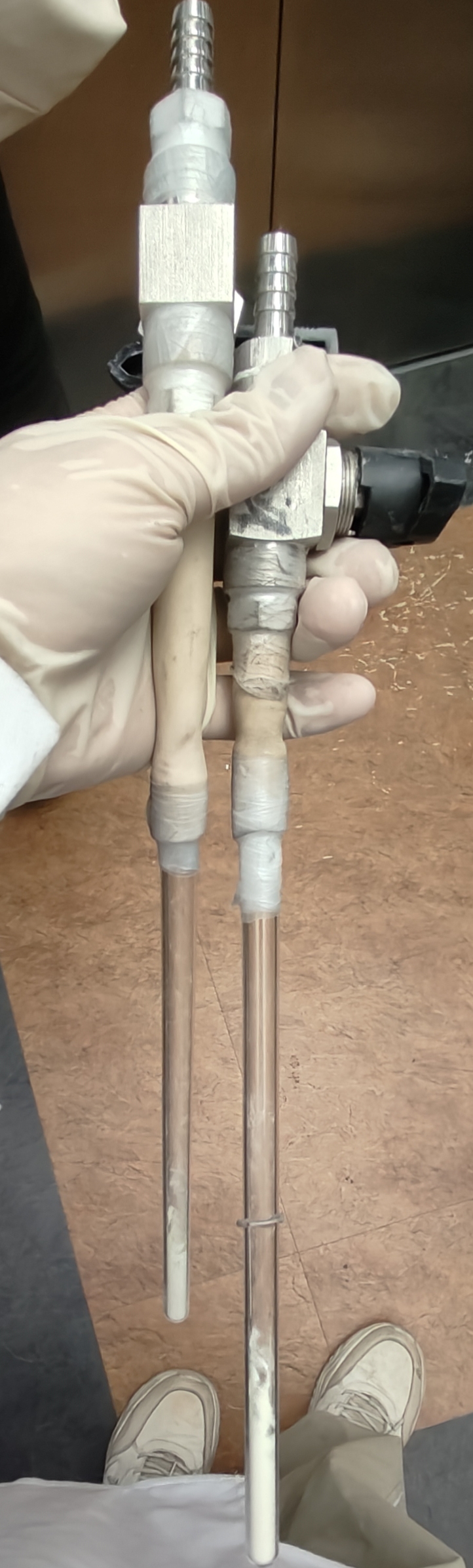 20日晚上19点,开始隔绝氧气烧结样品。在手套箱内将离心管中的试剂用长颈漏斗分别转移到两个长玻璃管里,然后怼上阀门,用封口胶密封上,然后去一楼首先将气阀门接入压缩机,将长玻璃管内的气体尽可能抽出,接着用