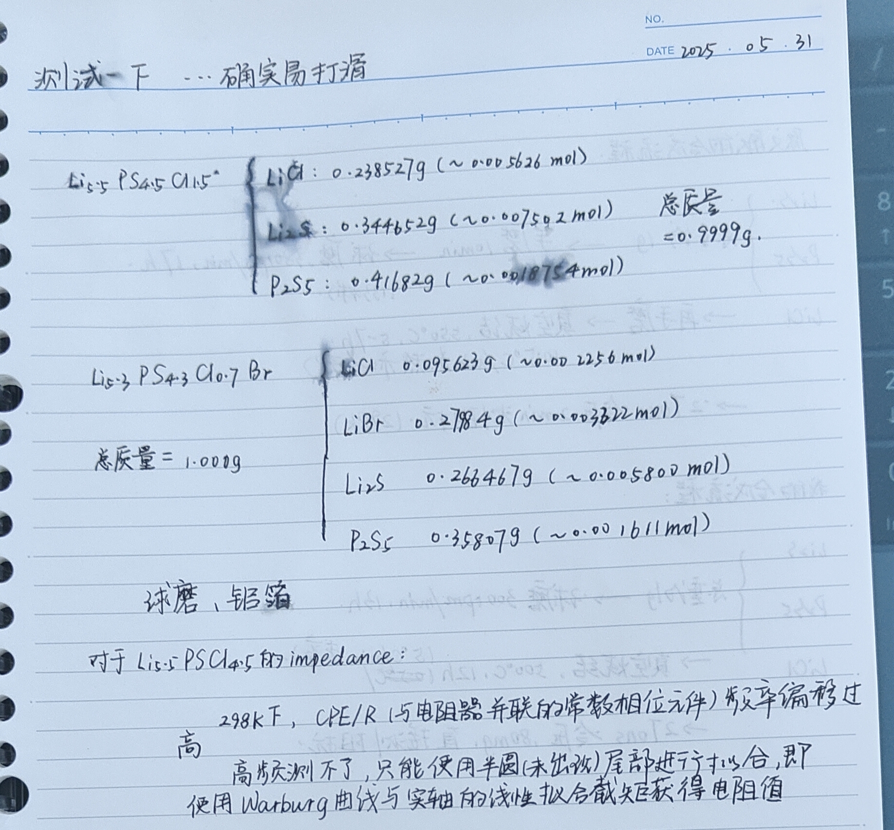 6.1(六一儿童节快乐🤓),今天大概又看了一下三月份的那篇综述。龙哥装测固态电解质的时候只需压机压倒2Tons了,后面问问它表面积的事,换算成MPa。模具中原盘的面积是0.785 cm