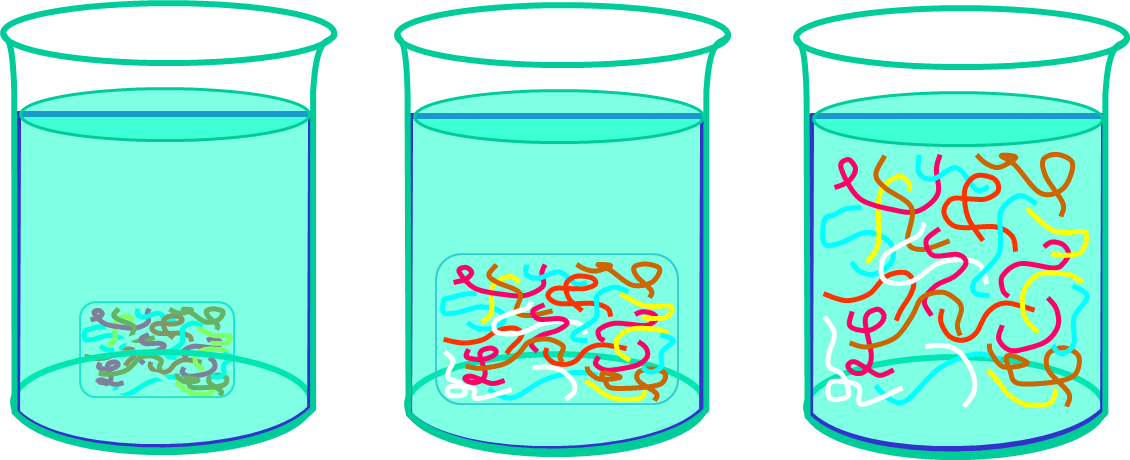 浓溶液和稀溶液最本质的区别:稀溶液中单个大分子链线团是孤立存在的,相互之间没有交叠;而在浓厚体系中,大分子链之间发生聚集和缠结。