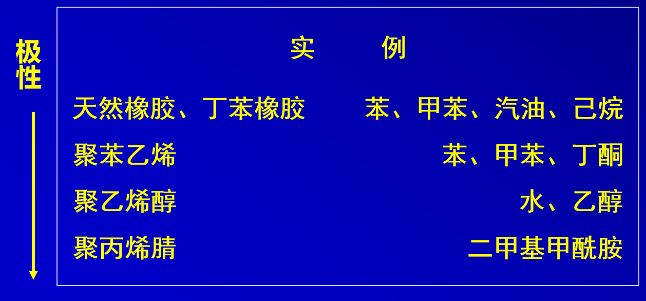 - PAN**(聚丙烯腈、强极性):包括合成纤维(如腈纶,也称人造羊毛)。溶于DMF(二甲基甲酰胺)、乙腈(强极性),但不溶解于与它δ值相近的乙醇、甲醇等。因为PAN极性很强,而乙醇、甲醇等溶剂极性太弱。