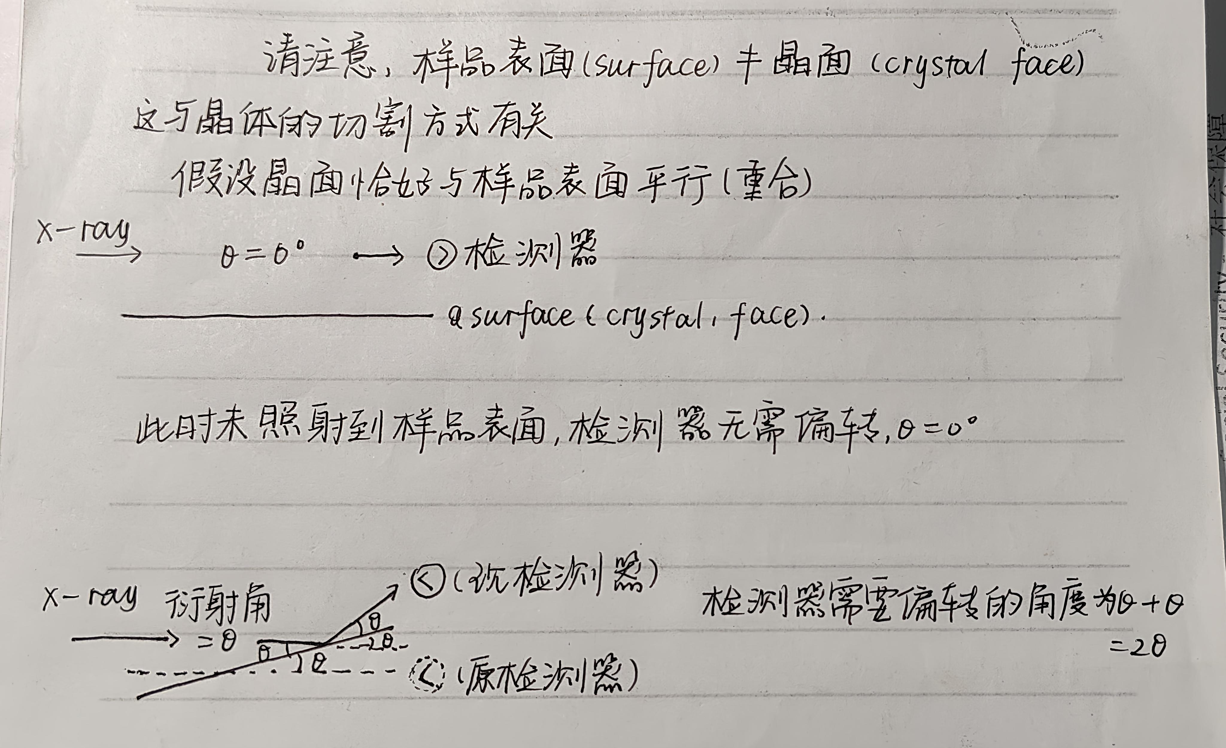 实验中,样品和探测器的转动是围绕同一轴进行的,因此 总偏转角的计算需要结合样品和探测器的相对运动,如下图所示