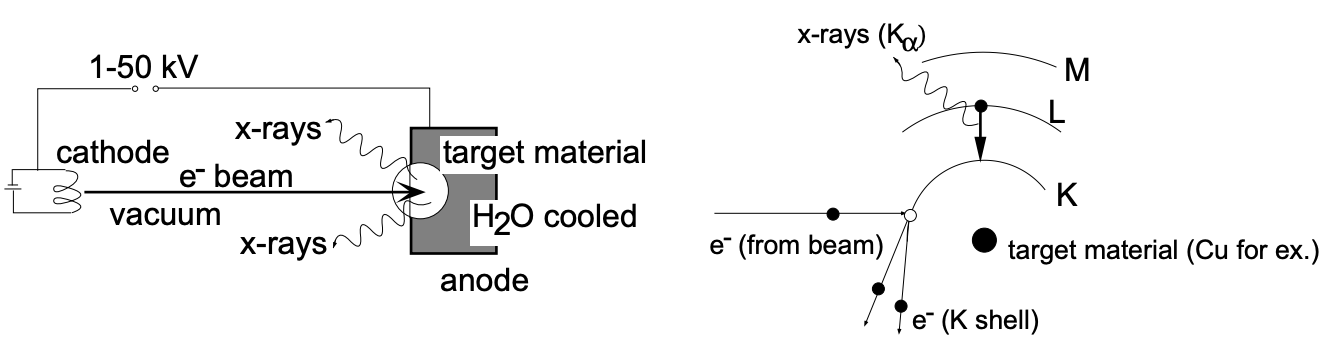 如下图,要引发这种内壳层跃迁,需要产生一个电子空位,必须从K层中移除一个电子。由高压电场加速过的阴极电子书轰击靶材,将其部分能量传递给靶材料的电子,从而导致电子激发。如果入射电子的能量足够高,一些电子可能会击出靶中 K 壳层的一个电子,从而产生一个空位
