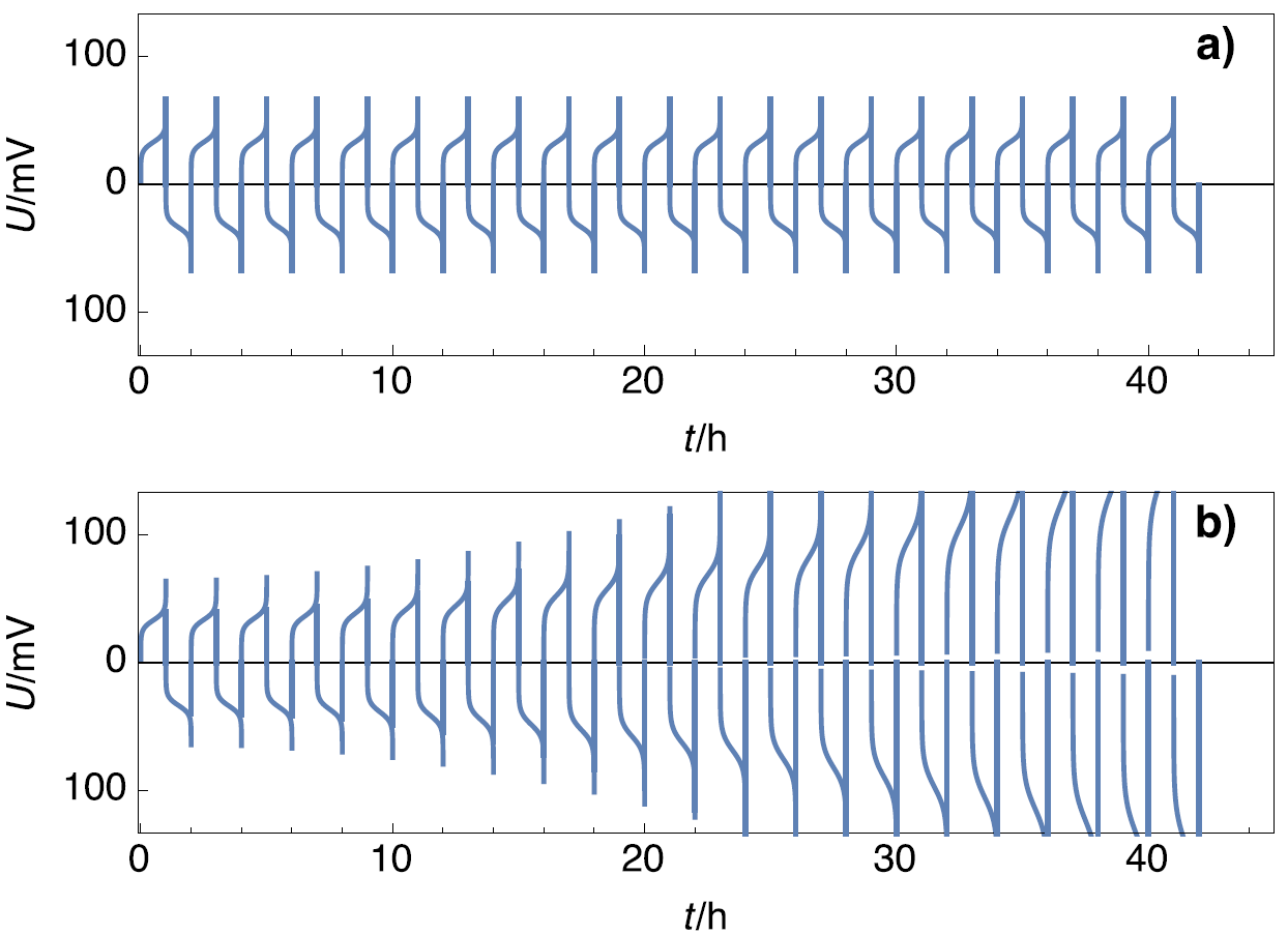 对称电池是一种简单且经验性的方法,用于测试电极在恒电流循环中的稳定性。对于锂金属电极而言,氧化可能导致表面降解,而金属沉积(锂离子被还原)则可能导致枝晶形成。下图a)展示了稳定电池和稳定电极的电压响应,其电压幅值不随时间变化;图b)则显示了由不稳定电极组成的不稳定电池的电压响应,其电位幅值会随时间发生变化: