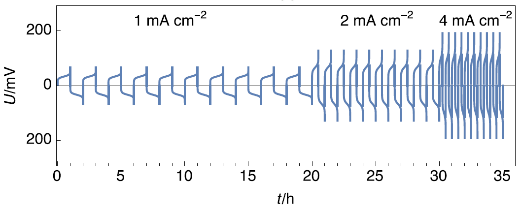 下图展示了在锂对称电池(Li | Li)上,以三种不同数值、正负相反的恒电流密度阶跃测试时,电压随时间变化的演变过程。