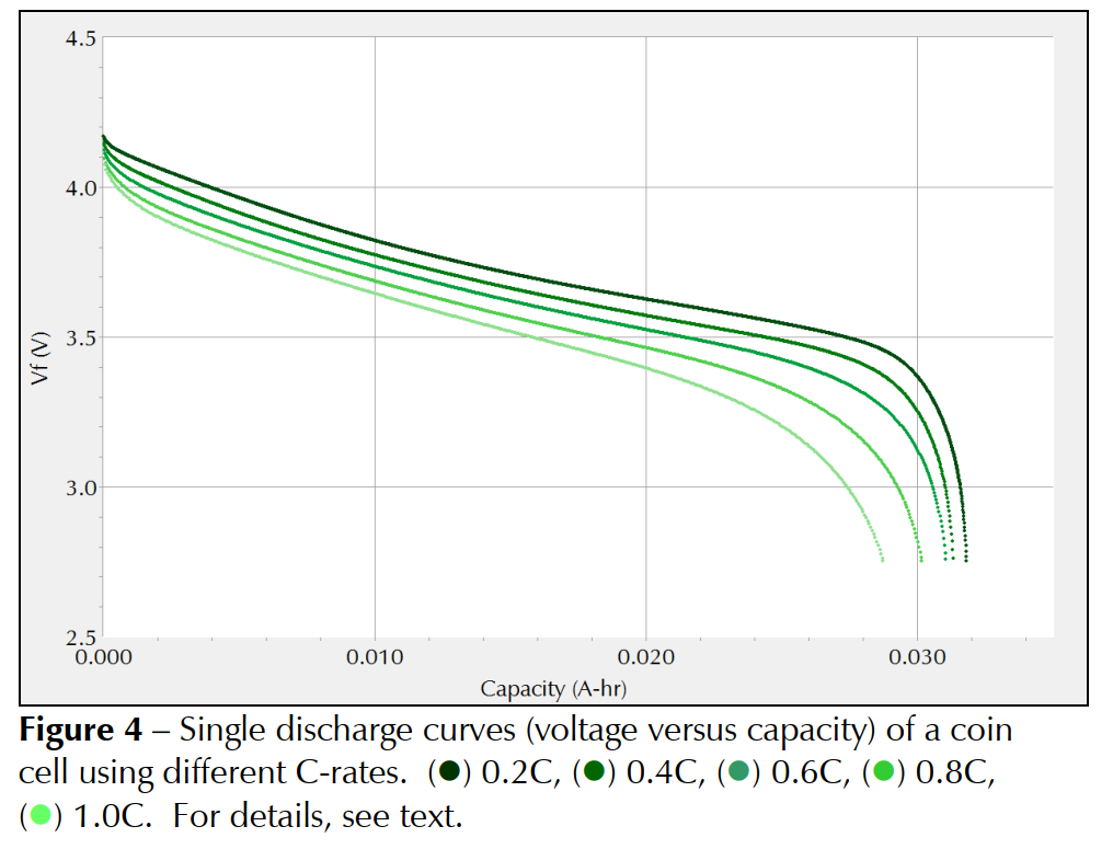 可以看到,随着倍率C的增加,放电时间减小,IR压降更多,因此容量也逐渐减小。