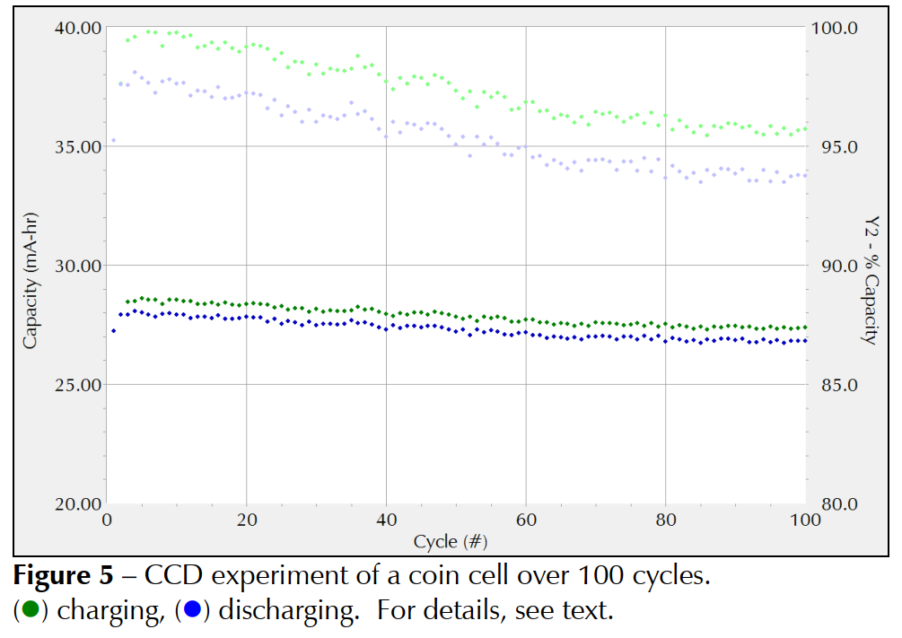 电解质杂质或电极缺陷总是会导致容量损失。 本例中测试的电池显示出良好的循环行为。 纽扣电池的最大容量约为 28.7 mAh。 100 次循环后容量仅略有下降。 总容量损失总和约为 4.5%。极端温度、过度充电或过度放电会加速容量损失。一般情况下,当容量损失超过20%时应更换电池。