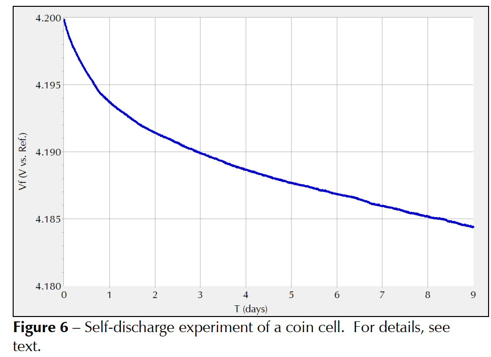 下图显示了使用新型纽扣电池的自放电实验图。首先将电池充电至 4.2 V,然后在此电位下保持恒电位三天。然后测量开路电位九天。