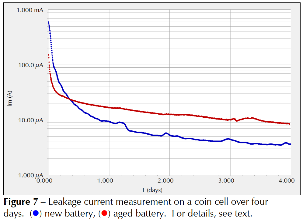在此情况下,新电池的漏电流约为4.7 μA,而老化的纽扣电池显示出两倍大的值,约10 μA。