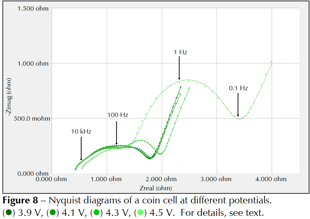 下图显示了不同电位下的四种不同的Nyquist图。纽扣电池首先分别充电至3.9 V、4.1 V、4.3 V和4.5 V。然后保持电位,直到电流降至1 mA以下。此步骤可确保电位在EIS实验期间保持恒定。恒电流EIS实验在100 KHz和10 MHz 之间进行。直流电流为零,交流电流设置为10 mArms