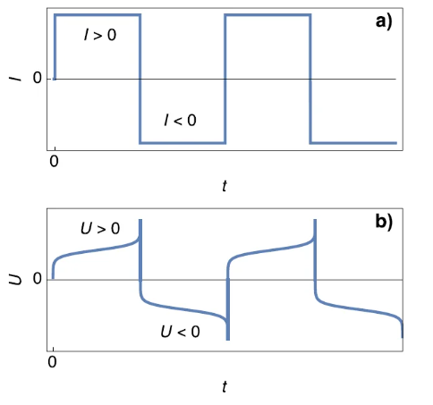 下图展示了对称锂电池在正负电流阶跃作用下的电位响应。