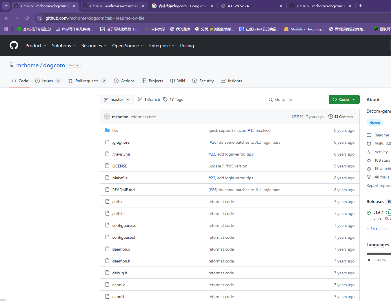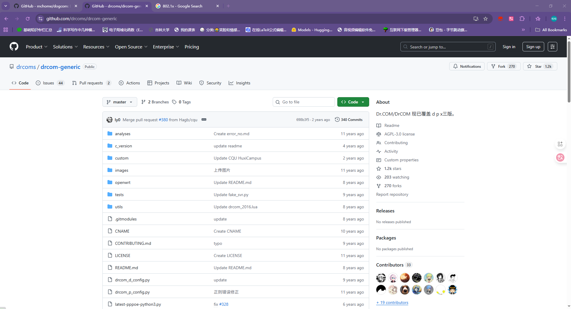 泥吉校园网使用的是哆点客户端,即Dr.COM认证(包括DHCP、PPPoE、802.1x三种认证方式,即D版、P版、X版),桌面端(windows、Linux、MacOS)下载客户端认证,然而Dr.COM备受吐槽、嫌弃,Arm路由器也无法使用Dr.COM。各位民间大佬分析了DrCOM的通信协议,开发了drcom-generic。当时的开发者是通过python2脚本来代替Dr.COM实现校园网认证的,下图是项目仓库。