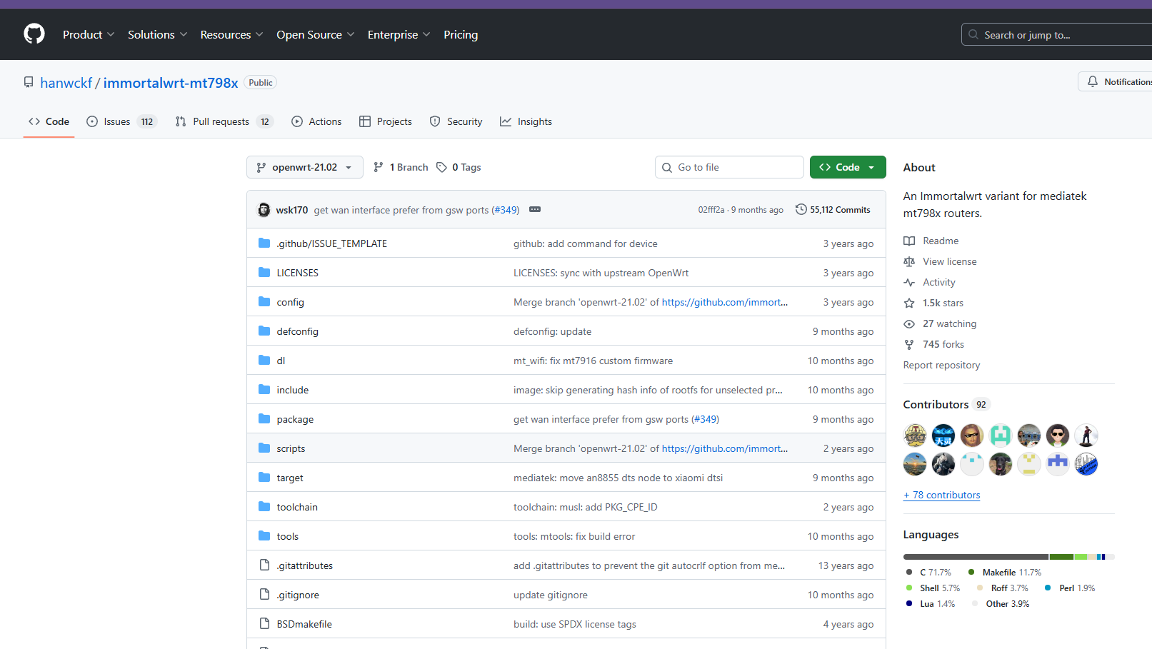 交叉编译环境需要固件的SDK,然而Immortalwrt并没有现成的关于MT 7981的SDK,还得先手动编译SDK😅。进入适用于处理器的Immortalwrt项目仓库,如下图。