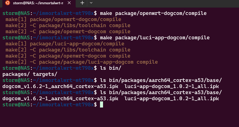 这两个软件包都不大,很快就编译好了,生成的ipk文件(适用于OpenWRT及其衍生发行版的安装包文件)在/bin/packages目录下: