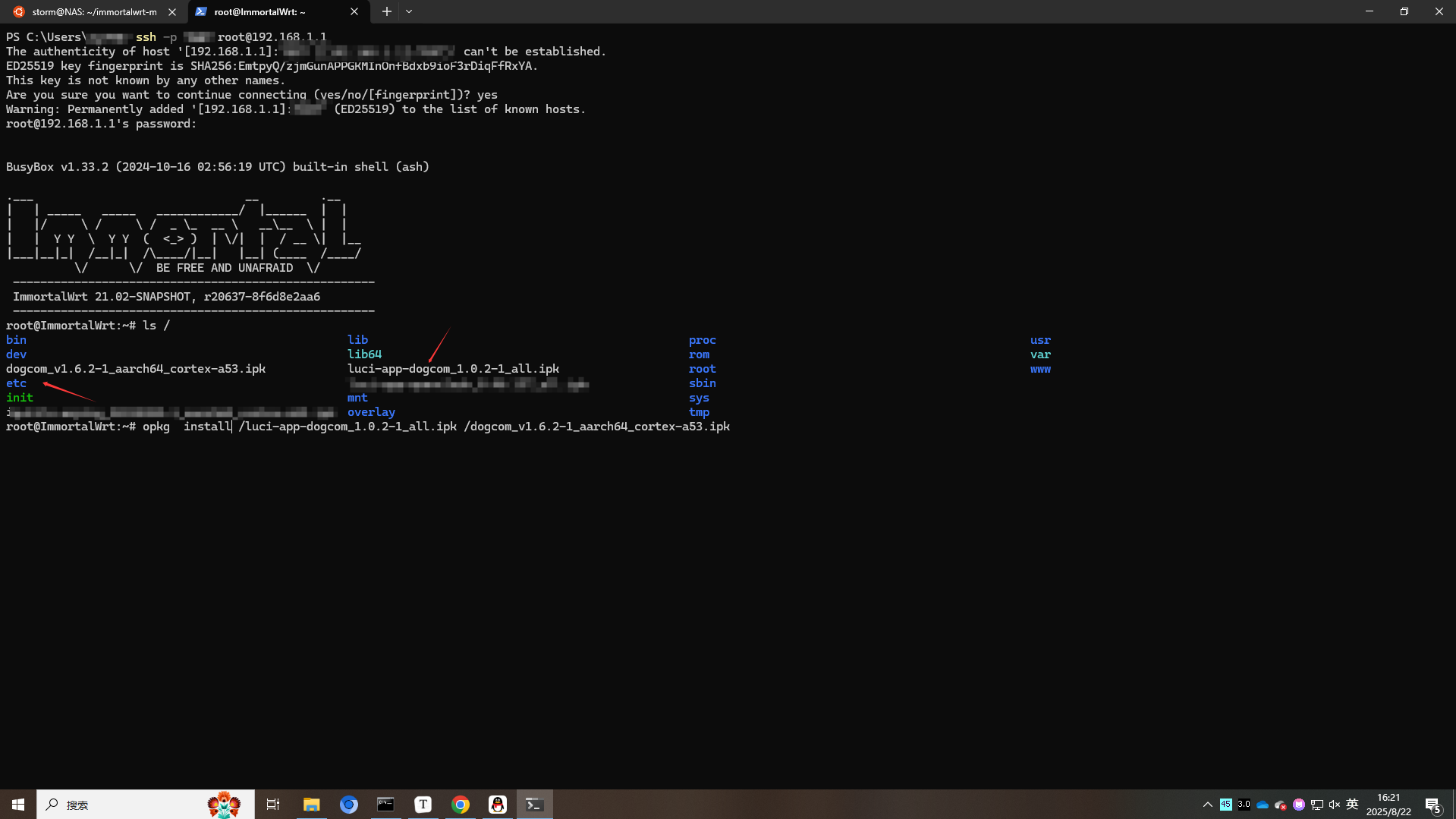 拿到ipk文件后就可以安装了。使用ssh登录Immortalwrt。使用winscp上传两个文件,OpenWRT及其衍生版的包管理器为opkg。